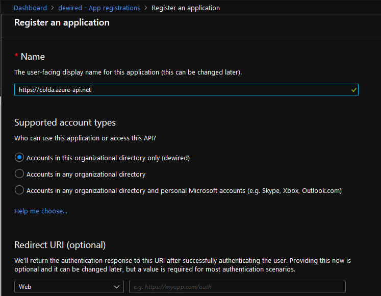 - For redirect URI we input nothing, because this application will only act as Service Principal “Front” for the actual app registrations consuming API management