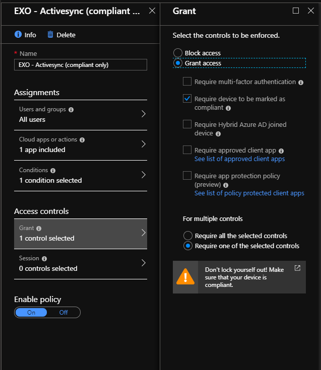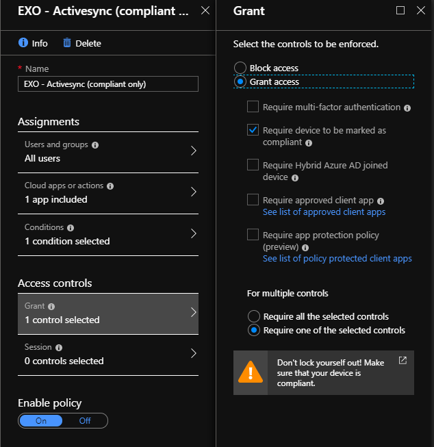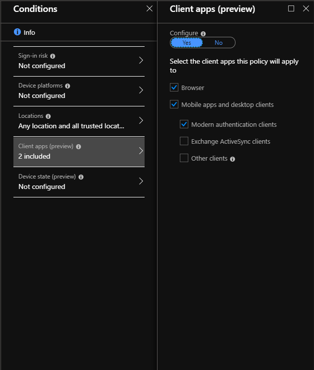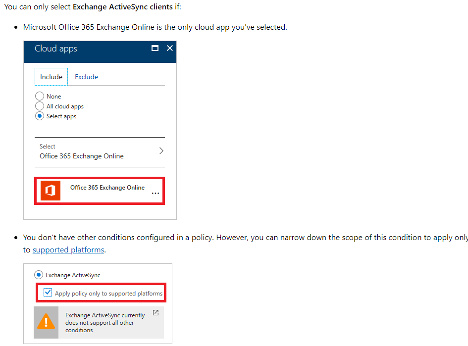 - In Conditions – Client Apps only ActiveSync is selected (and in scope of this blog, and other recommendations it’s recommended to narrow it down to ’Apply policy only to supported platforms’