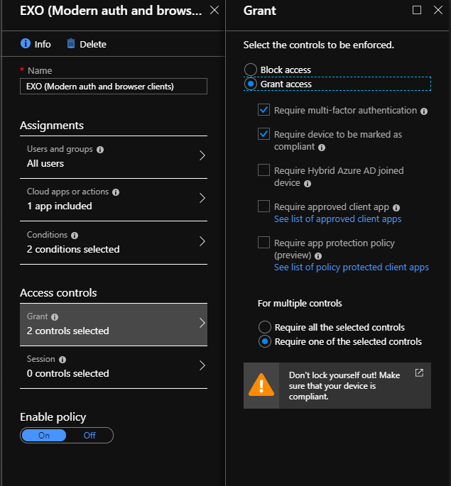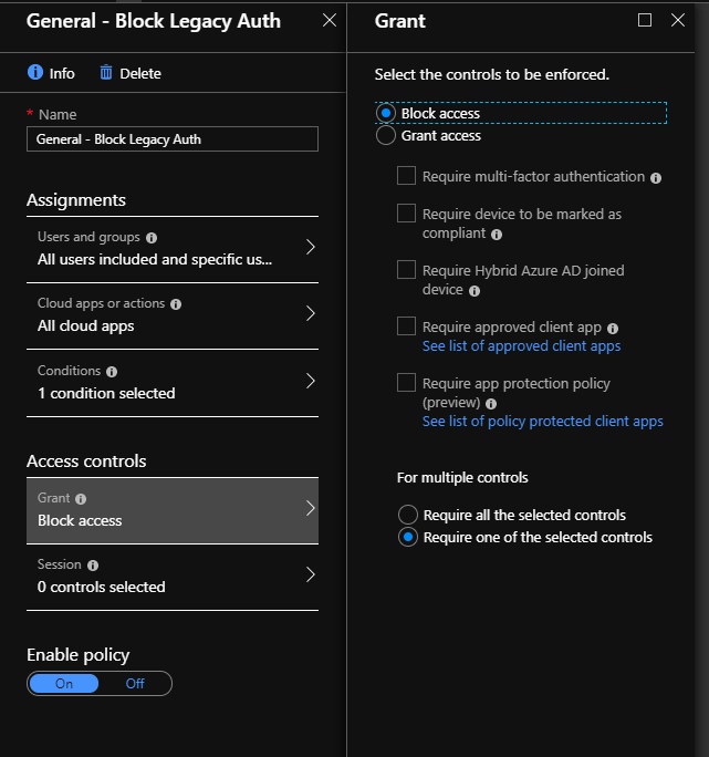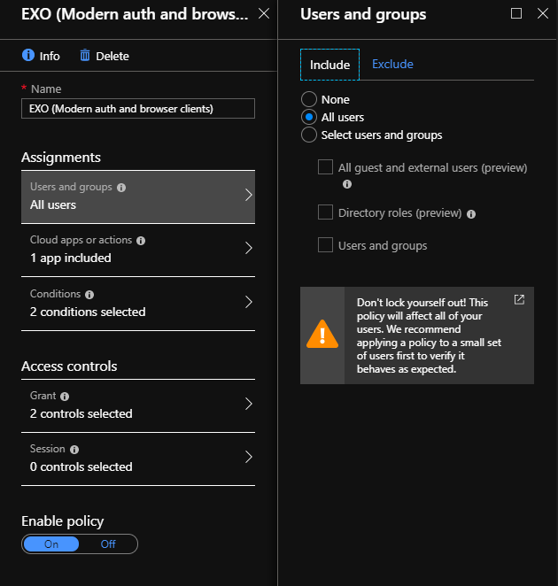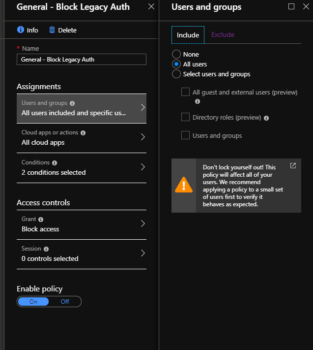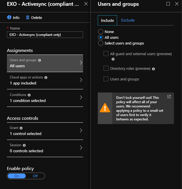 Note! you could possibly also use one of the built in baseline rules, as it doesn’t block EAS. I am opting for non-baseline policy because I may want to exclude some directory roles (service accounts) to another policy. The Policy also lists that it blocks the Native Android Mail Client, which I supported is still to some extent supported platform, and I want to maintain it in separate policy