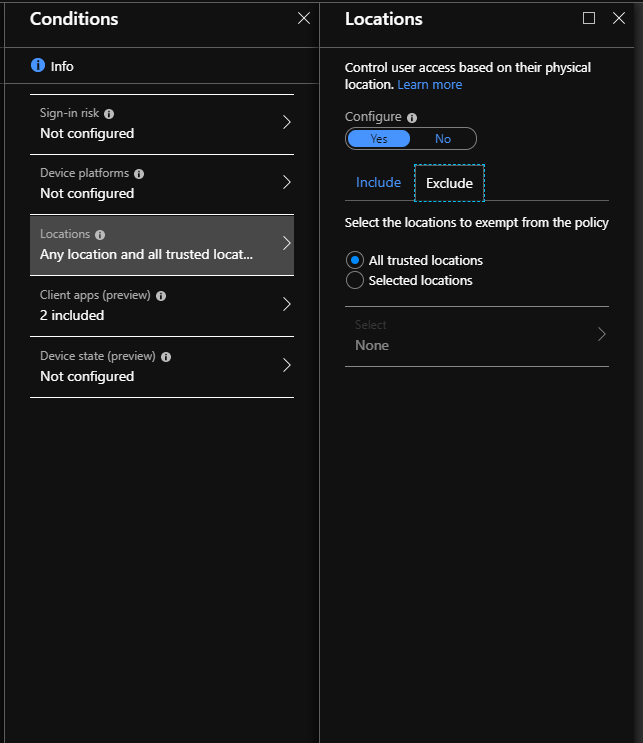 - Any way as a single mention is that, when you want to bypass certain account or action remember to narrow the bypass conditions so that for example the IP based bypass for a single service account is possible only for one application (meaning that Service account even in ”trusted location” won’t have any more access than the single app – unless specified otherwise.