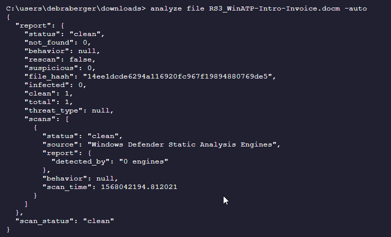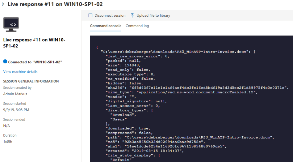 Note, that this console is not a normal Windows command prompt, but you’ll only have a limited number of commands available. You can find the full list of available commands here. There are a number of useful commands to inspect running processes, network connections, registry, etc. You can also inspect files and perform static analysis (in this case, the malicious Word document used in the previous blog post came out clean):