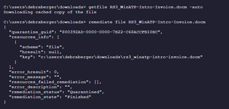 One useful command is getfile which allows you to download individual files from the remote client. If you have an analysis machine with proper tools in place, you can continue investigations there. You can also quarantine the file on the remote client by running remediate.