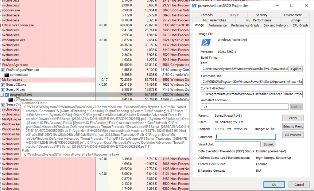 After a minute or so, I can see the PowerShell process in Process Explorer, and it’s running as a child-process of SenseIR.exe (under local system account).