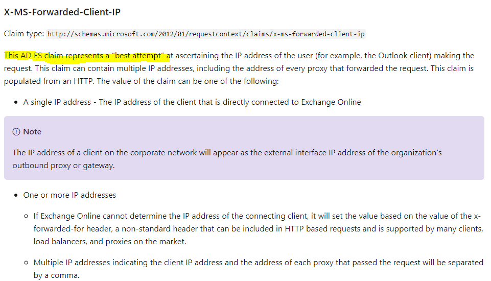 - X-MS-FORWARDED-CLIENT-IP is often advised to be used in many guides because MS Exchange Online Connections pass multiple IP’s in headers, and thus the actual client IP hitting ADFS includes both Exchange and the Client IP’s in the header