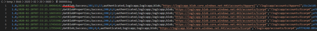 1.0;2020-02-20T07:33:25.0496414Z;PutBlob;Success;201;13;13;authenticated;logicapp;logicapp;blob;"https://logicapp.blob.core.windows.net:443/accounts/Apparel";"/logicapp/accounts/Apparel";