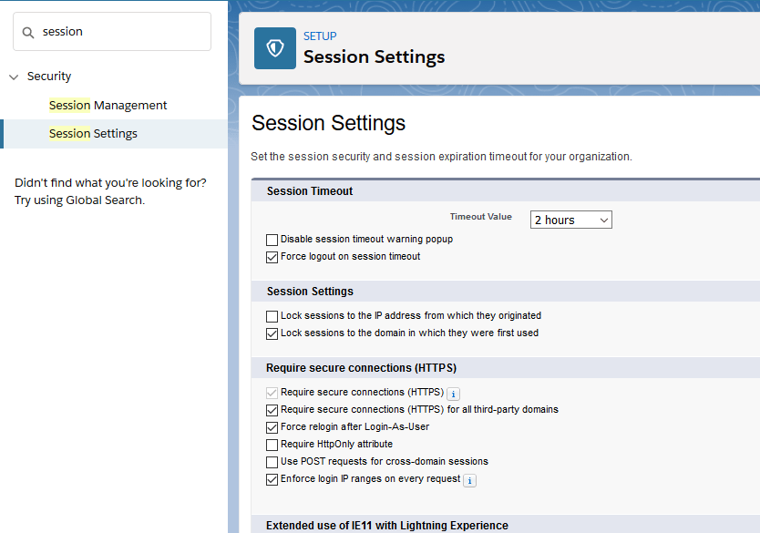 - In Security ‘Session Management’ Ensure IP restrictions aren’t just enforced on login by selecting this setting
