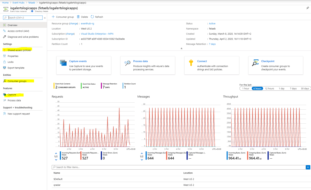 • Select a logical name for your Event Hub. Mine is ”isgalertslogicapps” to identify what’s the reason for this EH later on
