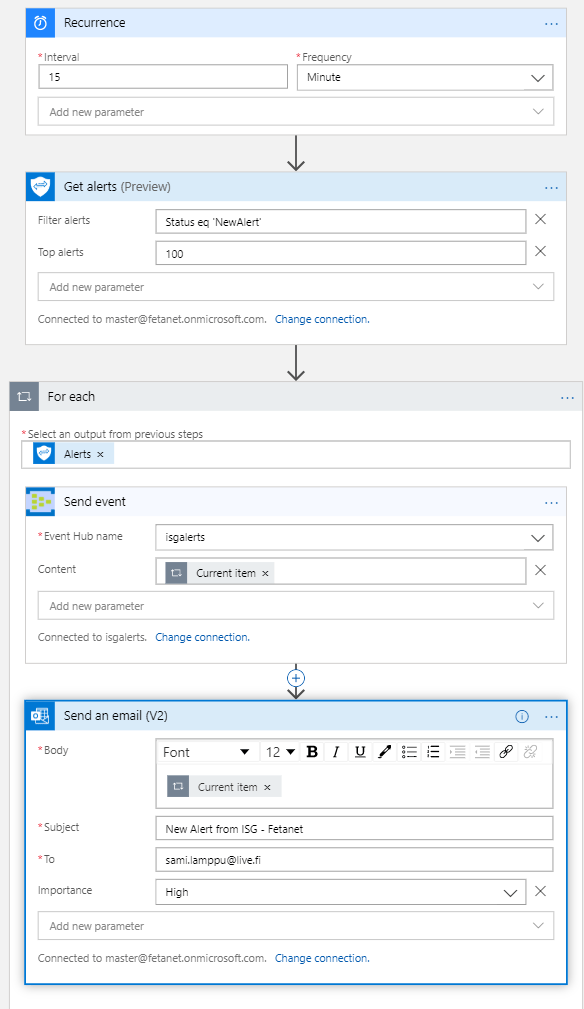 The logic behind this idea is to query alerts from ISG to Logic Apps and send them to Event Hub. QRadar has connector to Event Hub where it will pull the alerts.