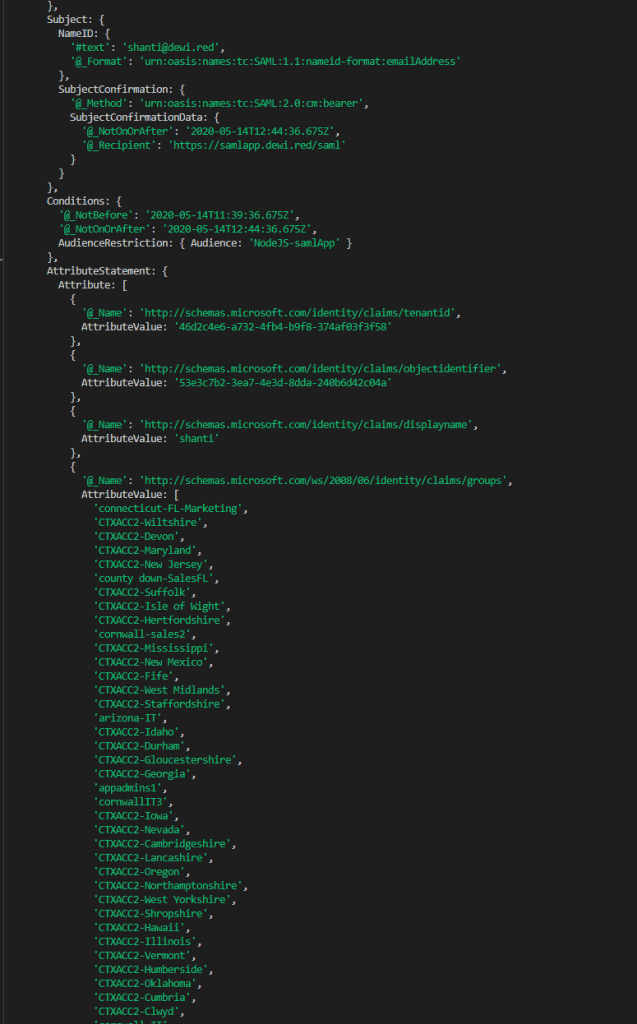 Following parsing code is used as expressJS middleware, to implement demonstrational SAML parsing functionality without verifying the SAML token itself. This is useful when you want to inspect assertions in the back-end test that information on functions you might be working. Such as updating back-end database stored information based on the information of such assertion