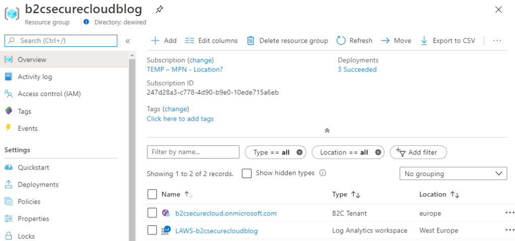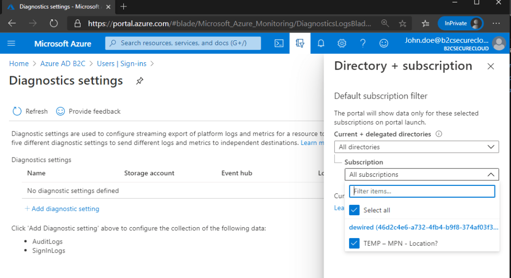 - You should have the delegation selected for both directories, and the subscription where the Log Analytics is in order to successfully deploy the monitoring to B2C tenant