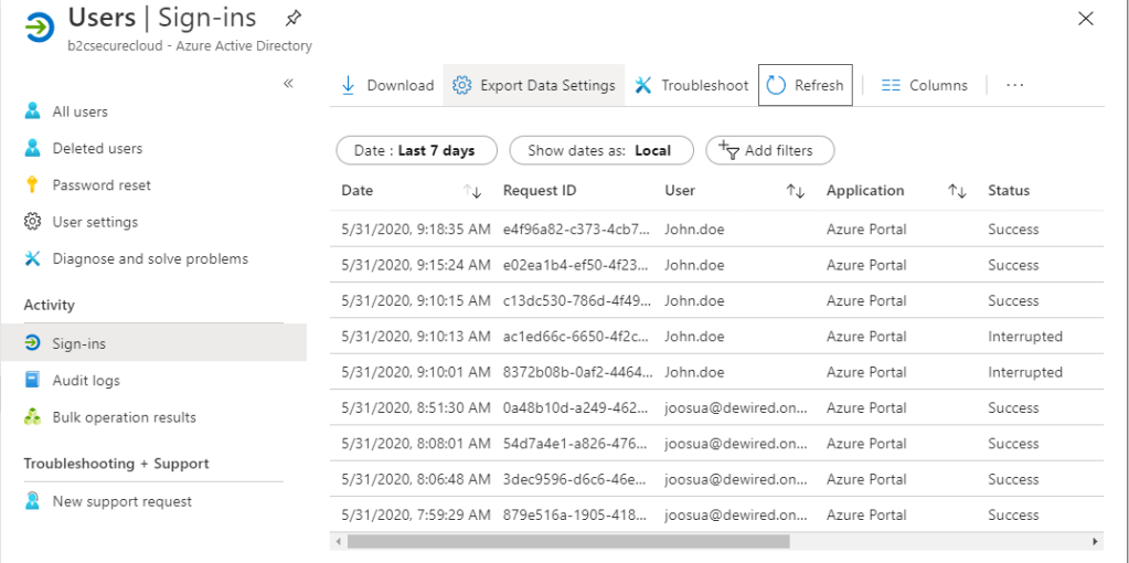 - Please note, that in Azure AD B2C Federated login goes to AuditLogs, and local directory sign-in goes to the SignInLogs