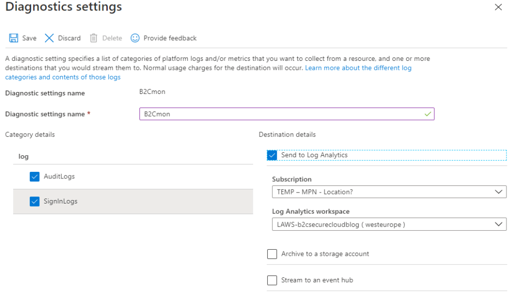 Great write up, I actually came across this having completed the above config after wading through the articles and sloly wrapping my head around it also. Whilst this covers Azure AD events in the B2C tenancy what I’m currently struggling to understand is how to monitor any changes made to the B2C configuration. If this was in a normal sub that would be achived via the activity logs which have their diagnostic settings defined at sub level. I can’t find any way of enabling Activity Logs for the B2C config, any thoughts?