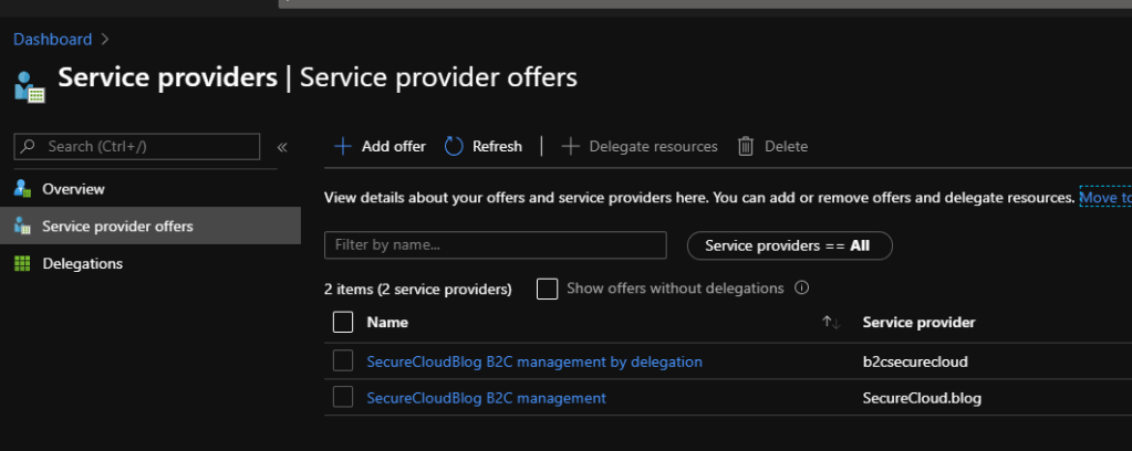 - By my quick testing it looks like the even though the MSP offering works correctly, its trying to fetch the registered providers from the B2C tenant which is the party using the delegation. You wont see this error if the admin account is present in both directories besides having access to the delegation (For example the user you used to create the B2C directory)