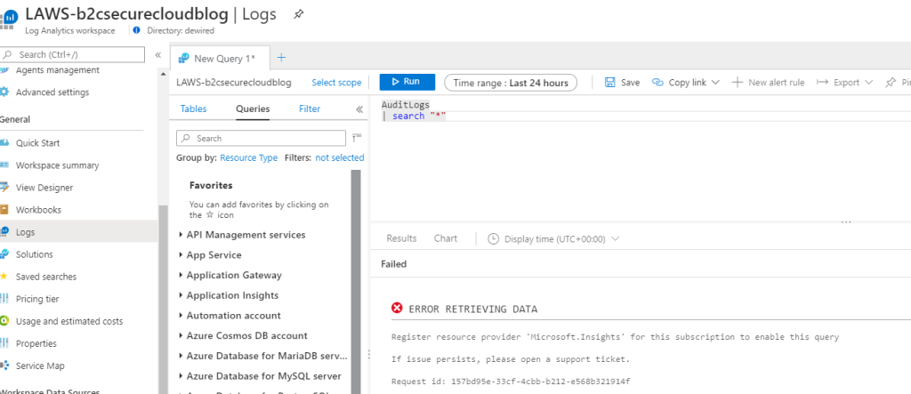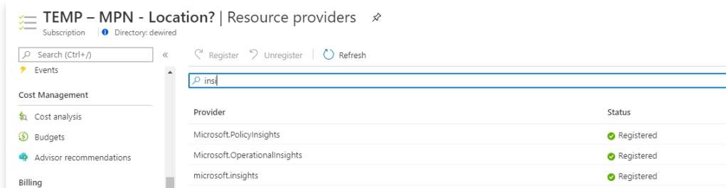 ERROR RETRIEVING DATA Register resource provider 'Microsoft.Insights' for this subscription to enable this query If issue persists, please open a support ticket. Request id: