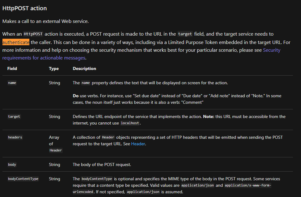 - This means, that when you develop the solution, the endpoint that does the messageCard action handling needs to be visible to that Microsoft service (in another words, the service needs to be publicly accessible)