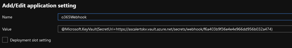 @Microsoft.KeyVault(SecretUri=https://ascalertskv.vault.azure.net/secrets/webhook/f6a403b9f36e4e4e966dd956b032a474)