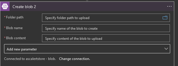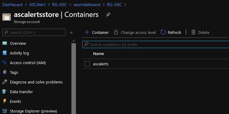 - After creating Azure Storage create new container ’ascalerts’ in the storage account