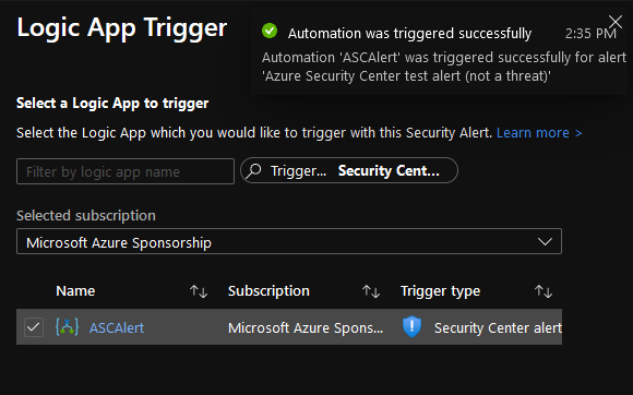 - Select ’Trigger Logic App’ from ’Trigger Automated Response’