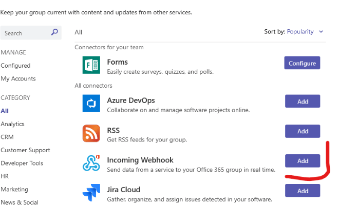 We create Teams Webhook in order to be available receive alerts via the webhook to Azure Security Center