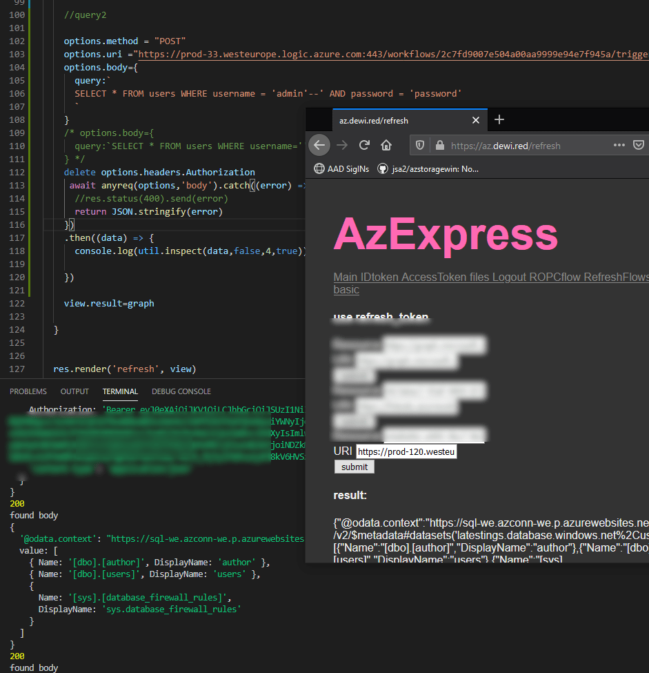 - Below is example of the very simple SQLI from un-sanitized user input that gets translated to SQL query, which I am passing from my NodeJS app.