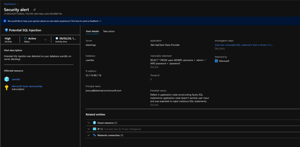 - Detecting SQL injection, and many data security options are available via the Advanced Data Security which is part of Azure Security Center Standard. The feature we are testing here is Advanced Threat Protection
