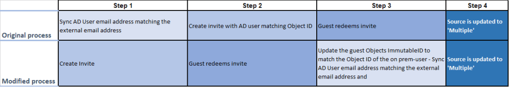 The modified order completes the same steps, but with fine differences in terms of how ImmutableID’s and ObjectID’s relate to the guest object in different phases of the flow