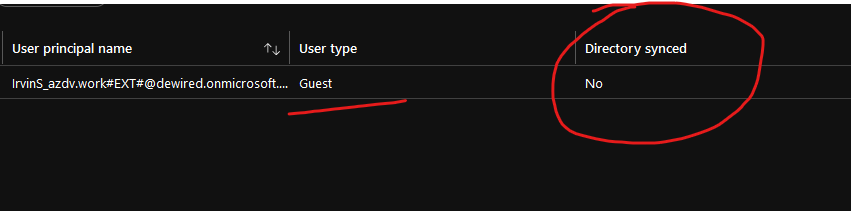 - After the invite is redeemed, the ’Directory synced’ remains as ’no’ (as expected)