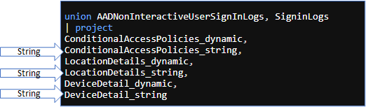 Here is example, when the table has same key (ConditionalAccessPolicies), but with different data type (string), whereas the other is dynamic. The problem, depending on your take here, is that the other data type is string, and can’t be iterable like the ConditionalAccess policies data in the SignInLogs table