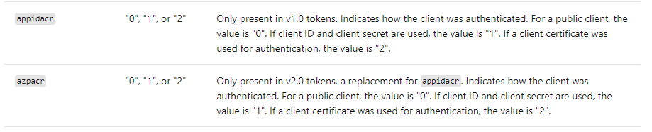 Since we can’t control the creation of weak client secrets in the first place (We surely can audit them though) it’s best to validate the use of Certificate Credential in the API management side; This can be achieved by validating that the signed JWT token includes ’appidacr’ (v 1.0 tokens) or ’azpacr’ (v2.0 tokens) claim, which Azure AD issues only when Access Token is requested successfully with Certificate Credential