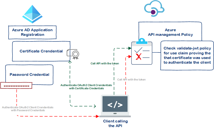 2. using Client Certificate (Signing the specific Jwt token with private key to receive access token from azure ad) – This blog will outline a way to ensure in API management that the second option was used to gain the token used in calling the API