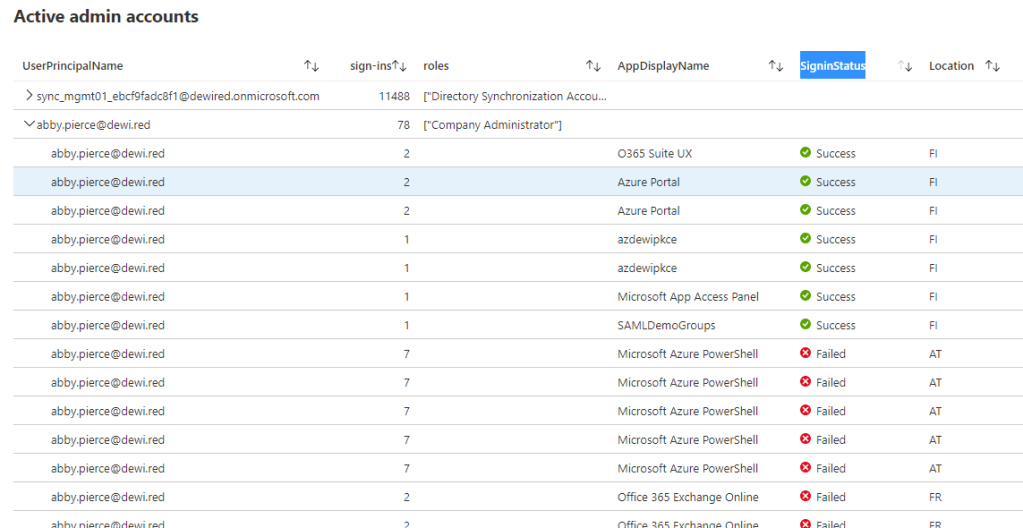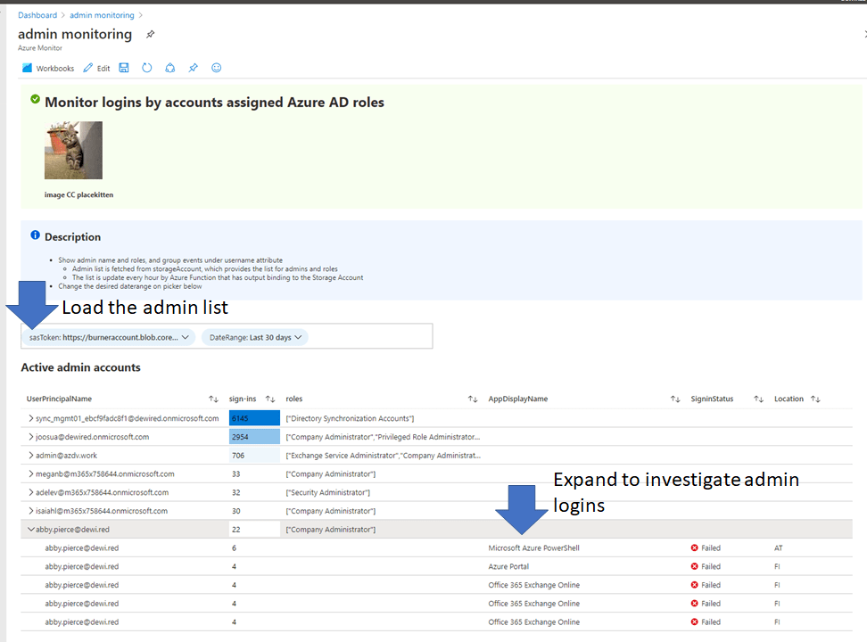 I started to create a solution, that would list logins based on the users Azure AD admin role. This can be achieved with the use of externalData() operator, and combination of Azure Workbooks,Storage and Functions.