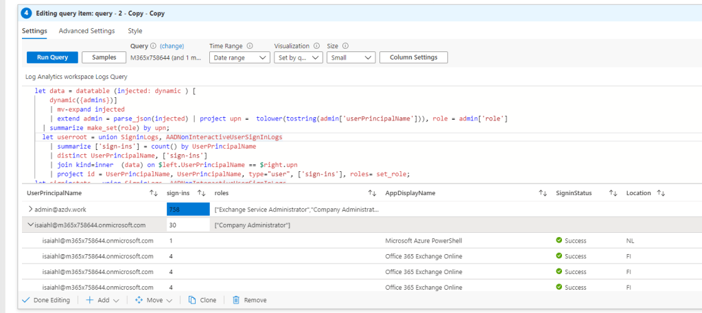 | extend admin = parse_json(injected) | project upn = tolower(tostring(admin['userPrincipalName'])), role = admin['role']