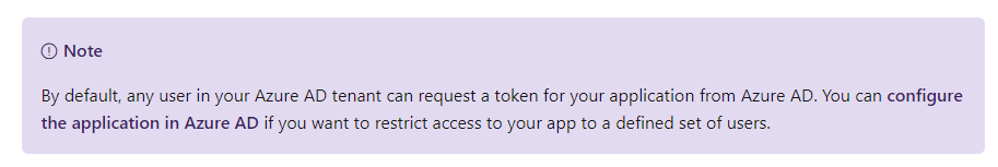 - Note: Easy auth by default does not restrict the Function for any user or SPN inside the tenant; it just verifies that the token was issued inside the same tenant, and has audience value that was registered for the function