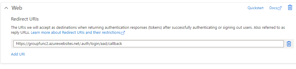 - For our use case we remove redirect-uri from the application and the user sign-in using IDtokens issued by removing implicit grant; This makes the API only callable by the SPN’s that bear the JWT token and the Function Authorization Key