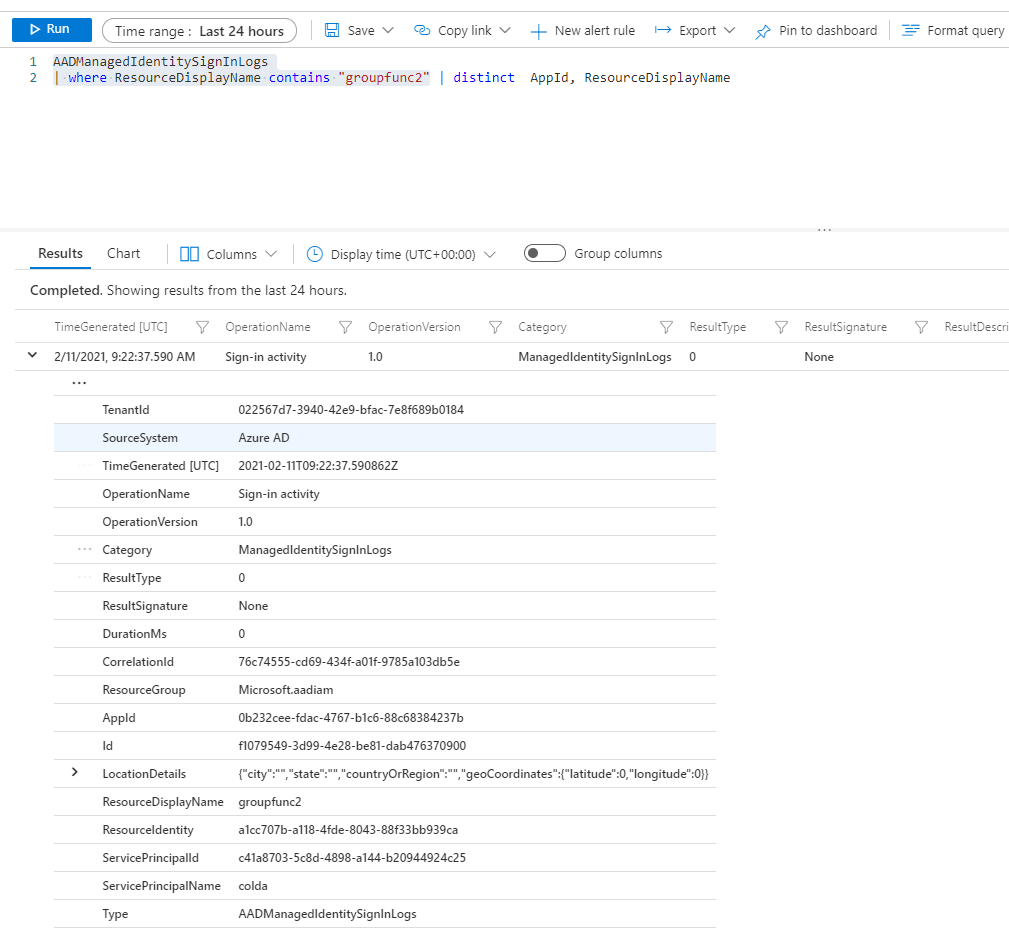 - If you have enabled logs for Managed Identity, you can see the event from Log Analytics for the Authorization