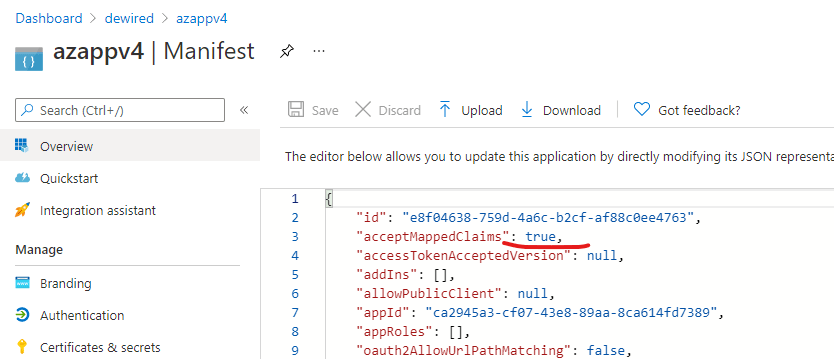 - From app manifest set ”acceptMappedClaims”