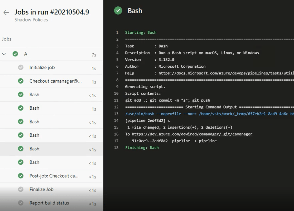 - Azure DevOps Pipeline ”Shadow Policies” picks up the change (timer trigger, but triggered manually in the demo to avoid delay)