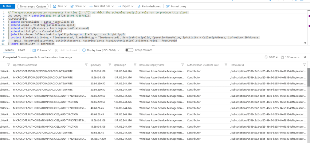 AzureActivity | extend parsedClaims = parse_json(Claims_d) | extend appid = tostring(parsedClaims.appid) | extend activityResource = tostring(parsedClaims.aud) | extend activityCor = CorrelationId | join kind=inner AADServicePrincipalSignInLogs on $left.appid == $right.AppId | project TimeInActivityLog = TimeGenerated, TimeInSPNLog = TimeGenerated1, ServicePrincipalId, OperationNameValue, ipActivity = CallerIpAddress, ipfromSpn= IPAddress, appid, ResourceDisplayName, activityResource, tostring(parse_json(Authorization).evidence.role), _ResourceId | where ipActivity != ipfromSpn