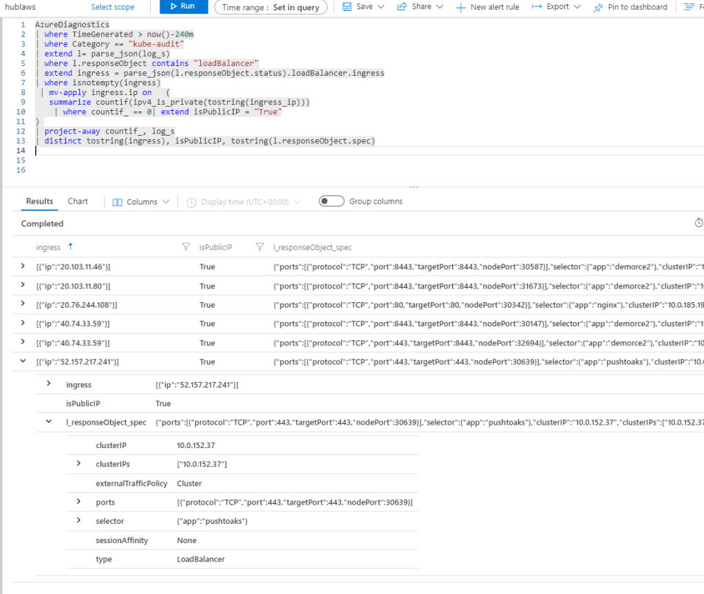 | distinct tostring(ingress), isPublicIP, tostring(l.responseObject.spec)
