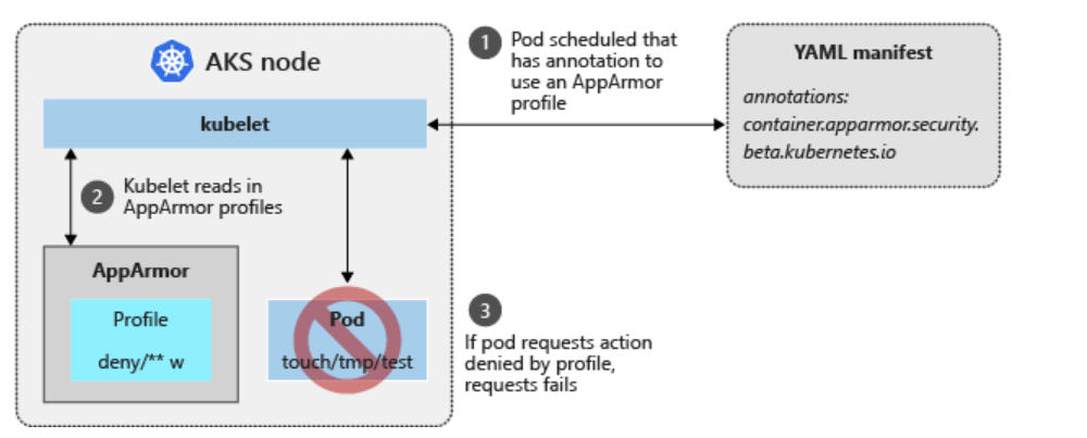 Microsoft provides good explanation on the appArmor control regarding AKS nodes at @docs. The important thing to note is, that while the appArmor annotation is defined in YAML manifest for pods, the actual policy is applied in AKS nodes (Kubelets)