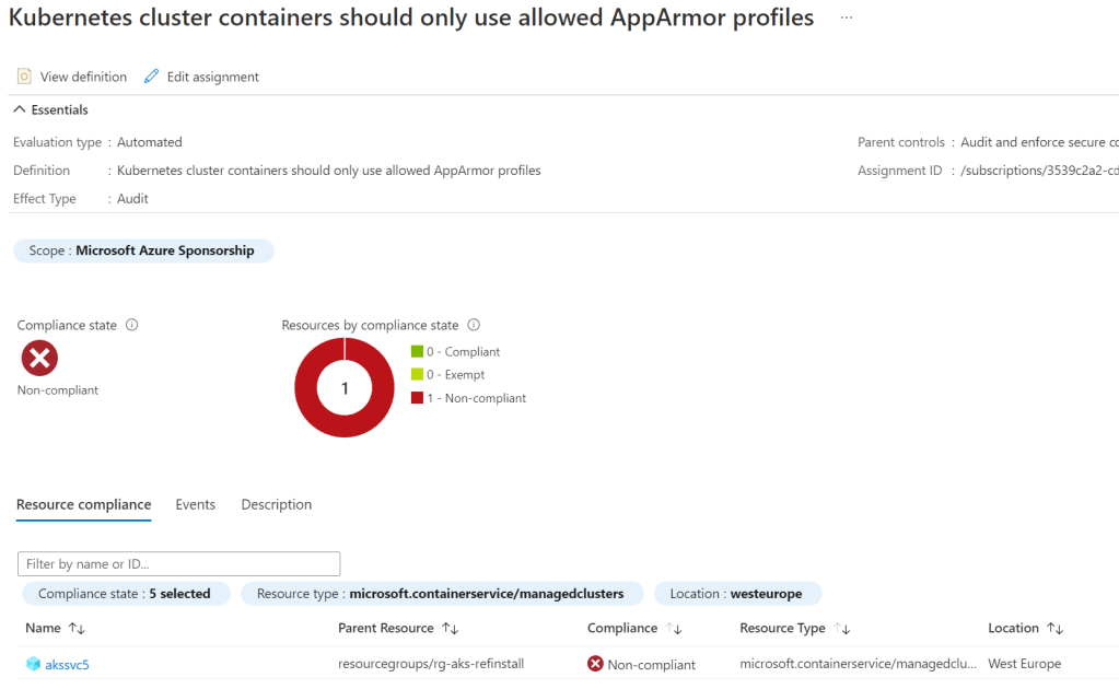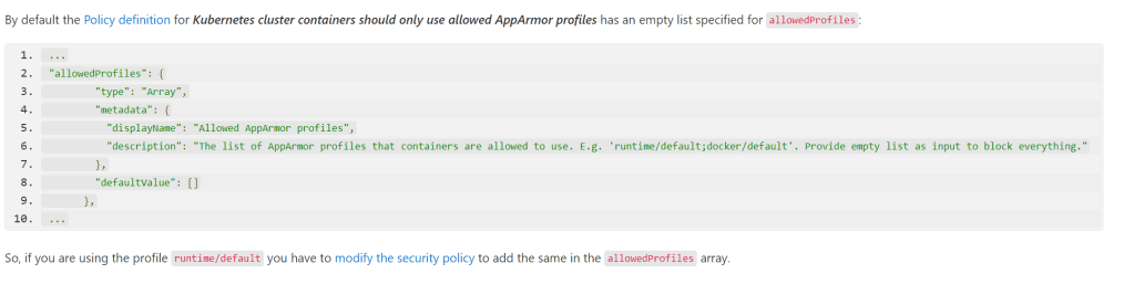 - The actual policy is named as follow ”Kubernetes cluster containers should only use allowed AppArmor profiles”