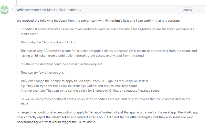 – Any 3rd party azure AD OAuth2 web app (not spa) that relies on refresh tokens lifetime to align to restrictions configured in Sign-in-Frequency. If the back-end is evaluating the user session based on refresh token validity, then the session length can exceed that of which is configured in SIF.