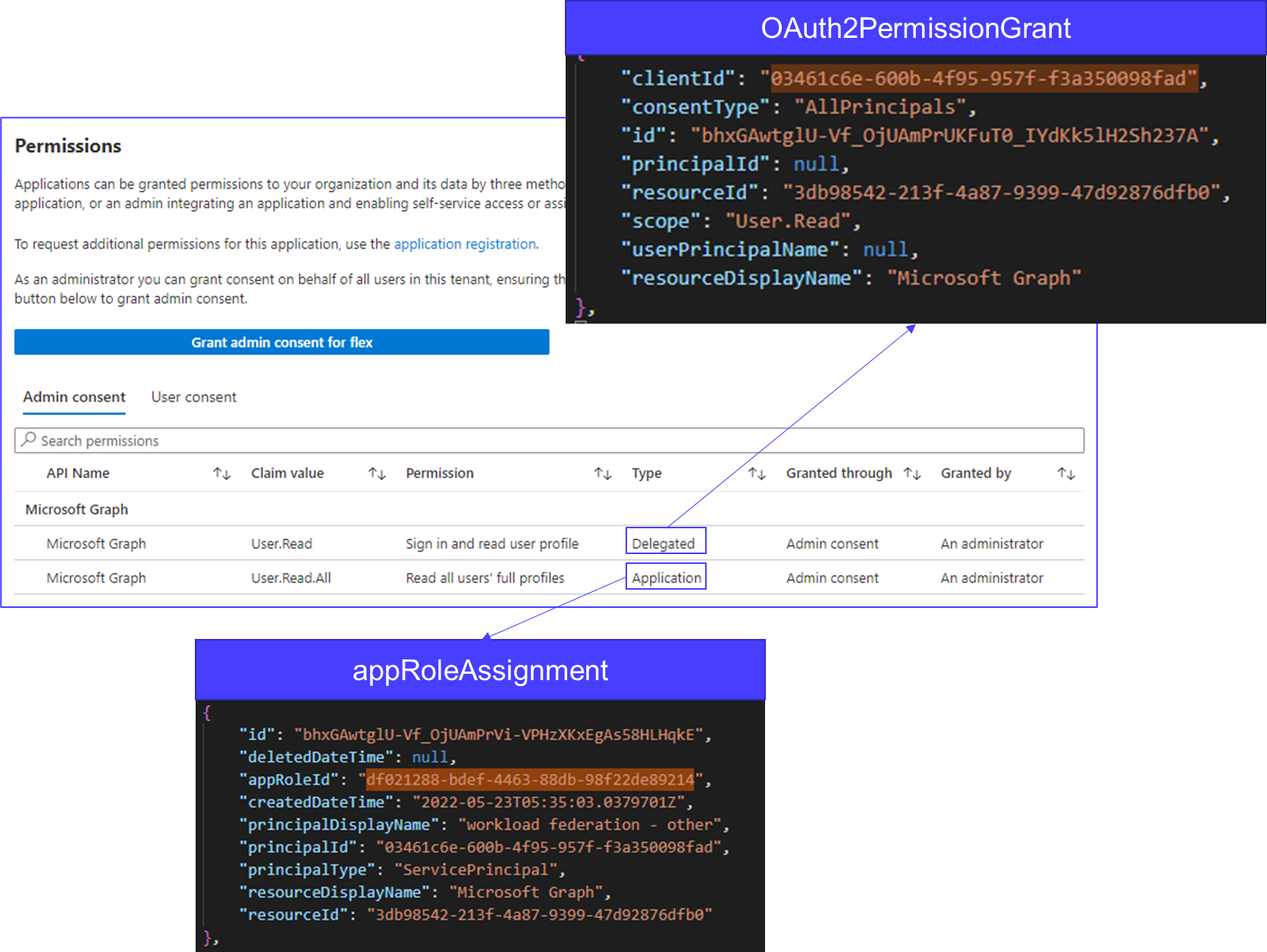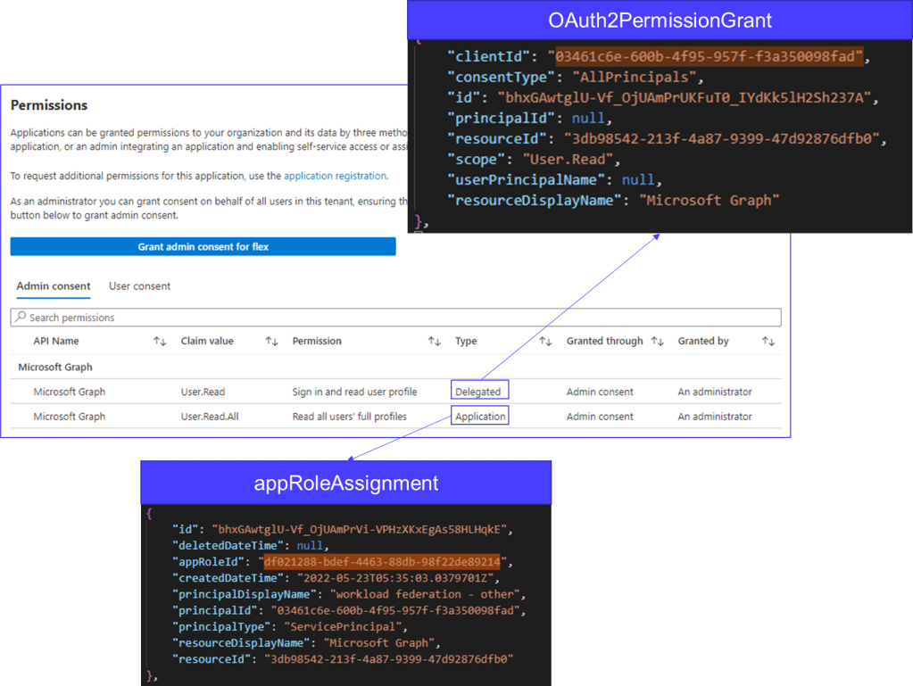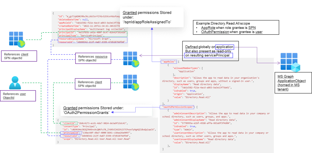 - Granted permissions always reference the servicePrincipal object. (AppRolesAssignment for applications, and Oauth2permissionGrants for users)