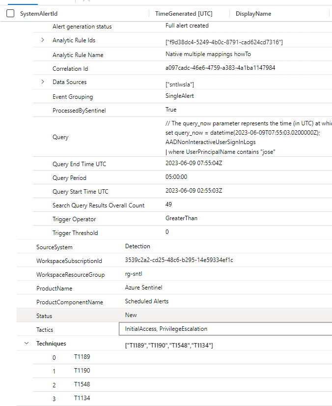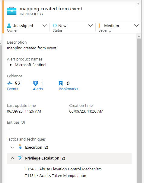 In order to understand how Microsoft maps these for the T&T’s selected from the analytics rule wizard, I checked one of the incidents created from the analytics rule